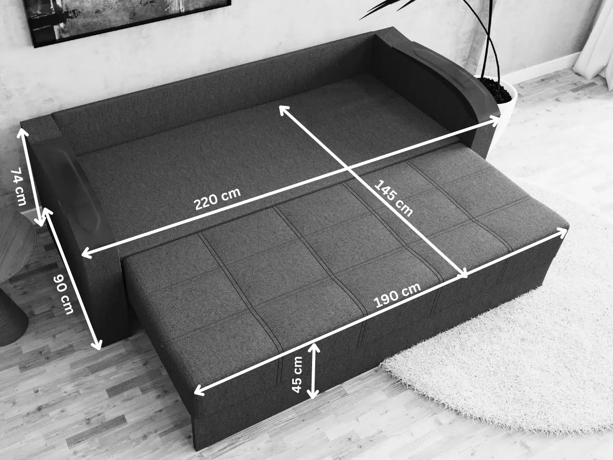Aceasta canapea extensibila cu lada pentru living are dimensiuni generoase, fiind potrivit pentru camere de dimensiuni medii si mari: 220 cm lungime, 90 cm latime, 74 cm inaltime totala. In plus, datorita posibilitatii de extindere, obtineti un spatiu de dormit cu suprafata utila de 145 x 190 cm.