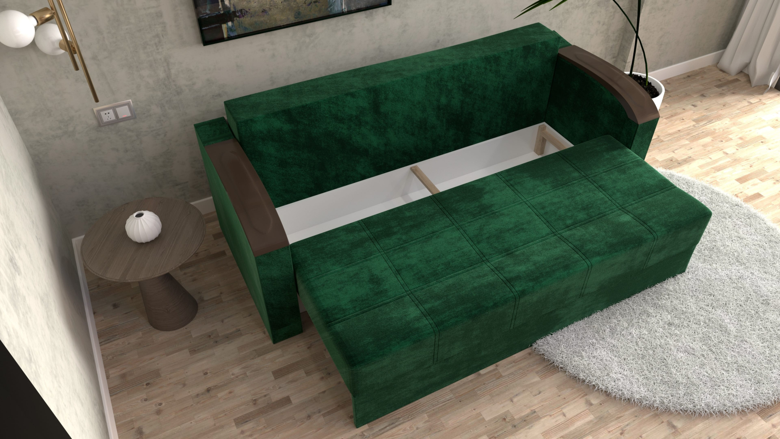 Canapeaua ofera lada de depozitare ideala pentru depozitarea lenjeriei, a pernelor sau a paturii. Scheletul este rezistent realizat pe structura din lemn si pal melaminat.