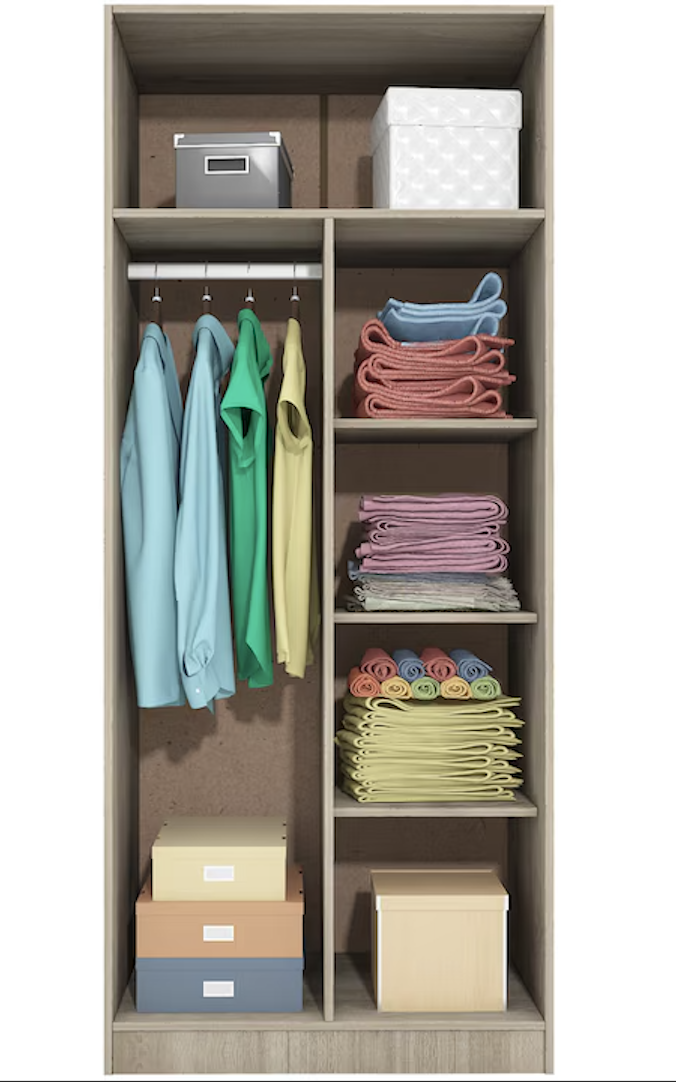 Dulapul are 3 rafturi pe laterale si unul mare + o bara de haine, creand astfel multiple spatii de depozitare.
